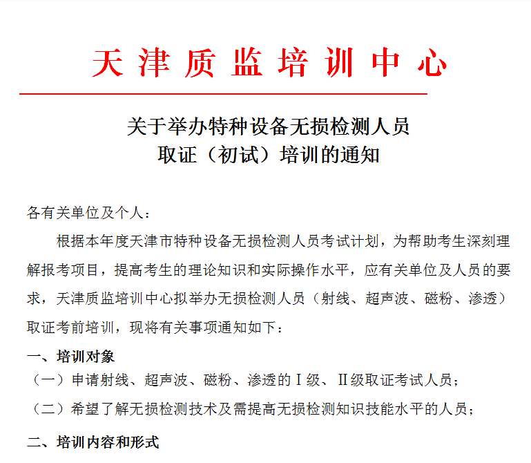關(guān)于舉辦特種設(shè)備無(wú)損檢測(cè)人員取證(初試)培訓(xùn)的通知
